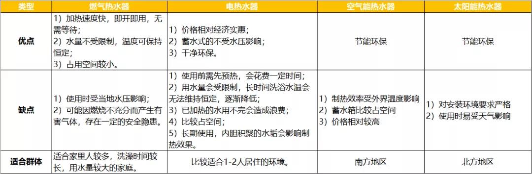 2019廚衛(wèi)電器選購攻略 | 熱水器篇 來源:未知 時(shí)間:2019年09月24日 秋季已至,南方依舊艷陽高照,北方早已遍地金黃。面對即將到來的雪花飄飄、北風(fēng)蕭蕭的冬季,是時(shí)候選購一臺適合一家老小的熱水器了。目前市面上的熱水器根據(jù)加熱方式主要分為燃?xì)鉄崴?、電熱水器、空氣能熱水器和太陽能熱水器。那這四者都有什么區(qū)別和優(yōu)缺點(diǎn)呢? 因素一:加熱方式 燃?xì)鉄崴?,通過燃燒天然氣或液化氣的方式來加熱水。加熱速度快,即開即用,無需等待,使用過程中,水量不受限制,且溫度可保持恒定,比較適合家里人較多,洗澡時(shí)間較長,用水量較大的家庭。但不足的是,一方面使用時(shí)會受水壓影響,水壓較低和不穩(wěn)定時(shí),可能會出現(xiàn)無法啟動和水溫不穩(wěn)定的情況,另一方面,可能因燃燒不充分而產(chǎn)生有害氣體,存在一定的安全隱患。所以,其對使用環(huán)境的通風(fēng)排氣條件有一定要求,嚴(yán)禁在不通風(fēng)或者通風(fēng)條件較差的環(huán)境下使用。另外,選購時(shí)需留意家里用的氣源是天然氣(管道輸送)亦或是液化氣(罐裝),以防買錯(cuò)。 這里需特別說明的是,燃?xì)鉄崴鞣譃橹迸攀胶蛷?qiáng)排式。前者是直接將煙氣排到室內(nèi),在通風(fēng)條件較差的環(huán)境中,煙氣中含有有毒氣體(如一氧化碳),很容易致人缺氧中毒,造成安全事故。所以在2000年5月1日,國家已禁止生產(chǎn)和銷售直排式熱水器。強(qiáng)排式則會通過管道和內(nèi)置小風(fēng)扇強(qiáng)制將燃燒后產(chǎn)生的煙氣排出室外,以此確保使用安全。 如何區(qū)別直排式和強(qiáng)排式? 1)看插不插電源。直排熱水器僅靠兩節(jié)干電池打火或者依靠人工點(diǎn)燃,而強(qiáng)排式熱水器必須有電源供電。因此觀察熱水器是否有插頭,需不需要插電源,是判斷是否為強(qiáng)排式熱水器的最簡單的方法。 2)觀察煙道。直排式燃?xì)鉄崴魃厦鏇]有煙道,強(qiáng)排式熱水器有煙道且較細(xì)。 電熱水器,通過內(nèi)膽中的導(dǎo)熱部件,將電能轉(zhuǎn)化為熱能,加熱儲存在里面的水。價(jià)格上相對便宜,使用過程干凈環(huán)保,且蓄水式的不受水壓影響,比較適合1-2人居住的環(huán)境。但使用前需先預(yù)熱,會花費(fèi)一定時(shí)間,且可用水量也會受到限制,一旦原先儲存的那部分已加熱的水用完,則水溫會無法維持恒定,逐漸降低。同時(shí),已加熱的水用不完后面也會逐漸冷卻造成浪費(fèi)。另外,電熱水器由于有一個(gè)蓄水部件,所以也比較占空間。長期使用,內(nèi)膽積聚的水垢也會影響制熱效果。 空氣能熱水器,安全環(huán)保,高效節(jié)能,其原理可類比為一臺單冷(只制冷)空調(diào),只不過是空氣能熱水器會把排到室外的廢熱,用于加熱水。它通過吸入周圍的熱空氣,將其中的熱量通過交換器抽離出來(此時(shí)形成的冷氣可直接排放到室內(nèi),就像空調(diào)一樣,也可以排放到室外),再借助管道和介質(zhì)運(yùn)輸?shù)綁嚎s機(jī),壓縮機(jī)將其中的熱量釋放出來,用于加熱水(對于空調(diào)則是直接將其排到室外)。 對于空氣能熱水器,是非常節(jié)能的,耗電量是電熱水器的1/3~1/4。但如果外界溫度低,則其制熱效率也會非常低,甚至需要用電輔助加熱。北方的冬季,本來用熱水就多,這時(shí)候空氣能熱水器反而不給力;而南方就好很多,即使是冬季氣溫也不會非常低,所以比較適合空氣能熱水器。目前空氣能熱水器的容量大多是150升以上的,蓄水箱體積很大,故一般只能放在陽臺或樓頂,且目前其價(jià)格相對昂貴,故只有用水量巨大時(shí)才能體現(xiàn)出它的節(jié)能優(yōu)勢。 太陽能熱水器,經(jīng)濟(jì)安全環(huán)保,但對安裝環(huán)境要求嚴(yán)格、使用時(shí)易受到天氣影響,臺風(fēng)、冰雹都會給太陽能帶來直接的破壞。一旦天氣不佳,日照不足,便需要用電輔助加熱了,所以適用于光照充足的地方。由于冬季北方地區(qū)的日照時(shí)間比南方的要長,所以太陽能熱水器更適合于北方地區(qū)。 綜上,四種類型熱水器的對比總結(jié)如下: 因素二 容量 [ 燃?xì)鉄崴?] 燃?xì)鉄崴髦饕?/span>10升、11升、12升、13升、14升、16升 等。這個(gè)升數(shù)是指將水溫升高25℃時(shí),1分鐘內(nèi)可出的熱水量。如14L的燃?xì)鉄崴?,即表?分鐘內(nèi)它能把14升的水由原先的溫度加熱升高25℃ 。 至于選擇多少升數(shù)的合適,如居住是一廚一衛(wèi)的房子,且衛(wèi)生間和廚房都需要熱水供應(yīng),建議選10-12升。如是一廚兩衛(wèi)的房子,且衛(wèi)生間離廚房距離較遠(yuǎn),建議選13-16升,具體選擇多大升數(shù)的燃?xì)鉄崴?,還要根據(jù)家庭成員以及熱水用量來決定。 [ 電熱水器 ] 加熱功率(W)表示電熱水器將電能轉(zhuǎn)化為熱能的能力。加熱功率大,則該電熱水器將電能轉(zhuǎn)化為熱能的能力強(qiáng),輸出的熱量多。 目前市場上銷售的電熱水器容量主要為30-100升的。一般來講,單身貴族可選30-50升,二人世界可選50-60升,三口之家可選60-70升,祖孫同堂可選70升以上的。 因素三 其他功能 燃?xì)鉄崴鳎阂蛉細(xì)鉄崴鲗λ畨旱囊筝^高,對于一些水壓較低的地區(qū),如高層住宅、城中村或部分鄉(xiāng)下地區(qū)。在選購燃?xì)鉄崴鲿r(shí),應(yīng)選擇具有“低水壓啟動”功能的燃?xì)鉄崴?,若?dāng)?shù)貙τ