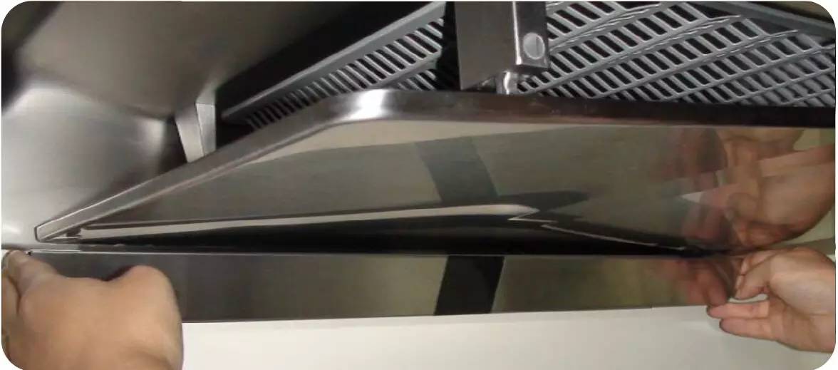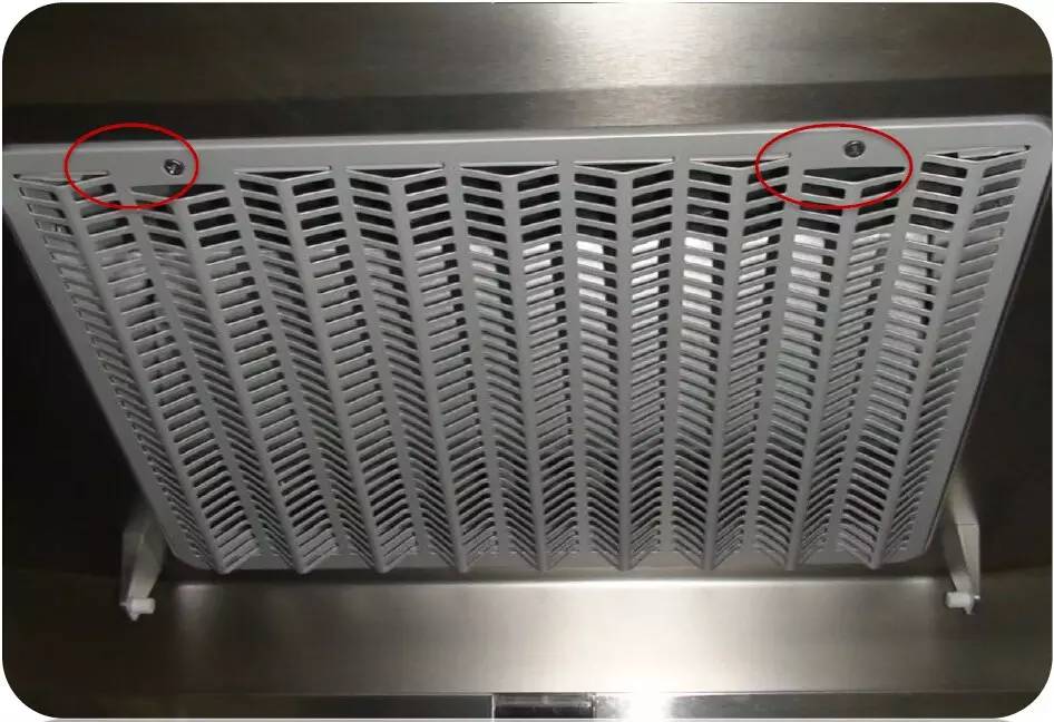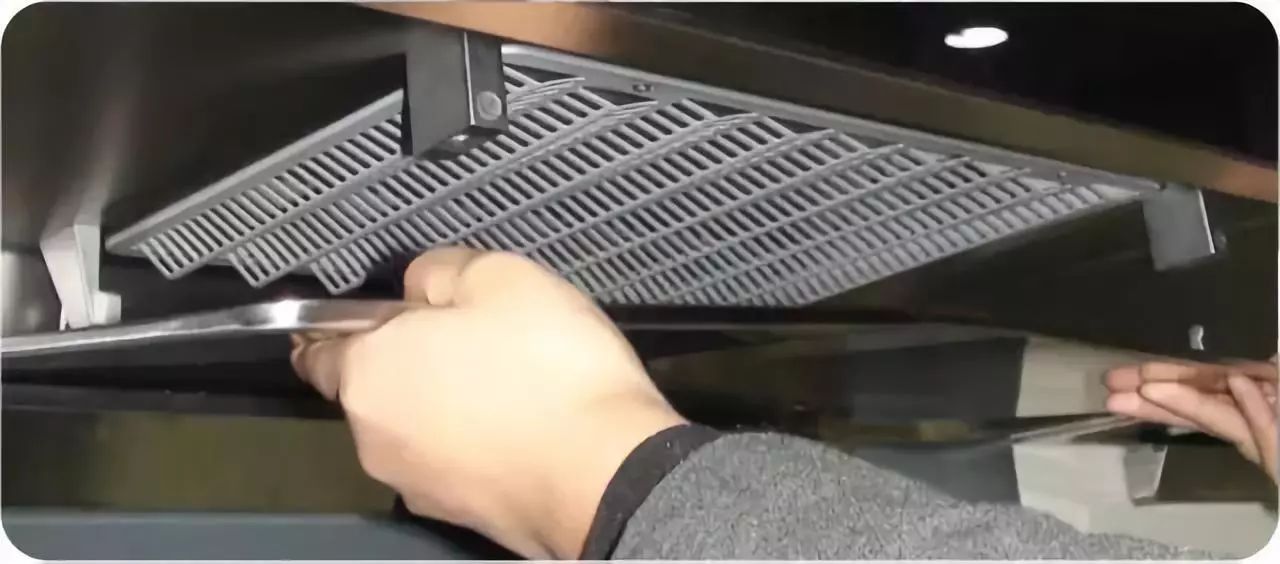 操作方法:關閉電源前打開隔煙屏,雙手拉住格柵左右兩側,向外拉即可打開格柵,將格柵向下旋轉一定角度,并向外抽拉即可將其卸下;然后,同樣用浸有中性清洗劑的軟抹布清洗格柵并擦拭進風口圈外表面。