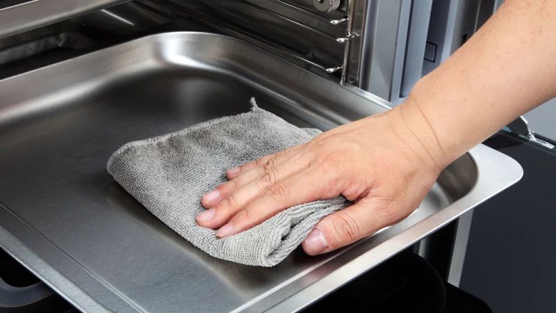 每次烹飪完,須及時用柔軟抹布擦干內(nèi)膽、門體及冷凝水槽內(nèi)的殘留的冷凝水,如果烹飪過程中有在內(nèi)膽產(chǎn)生凝結(jié)物,還需要使用海綿或吸濕力強的軟布蘸取中性洗滌劑加溫水的混合溶劑來抹去內(nèi)膽內(nèi)壁的凝結(jié)物。