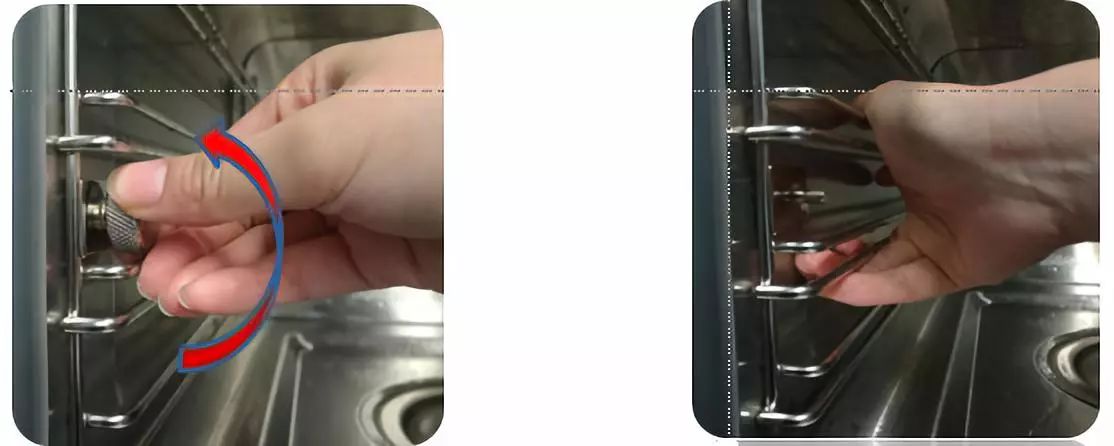 溫馨提示:清潔內(nèi)膽前,先取出兩邊的側(cè)支架(將兩邊固定的旋鈕擰下即可取下支架),清潔會更容易。關上蒸箱門前,確保內(nèi)膽已完全干透。