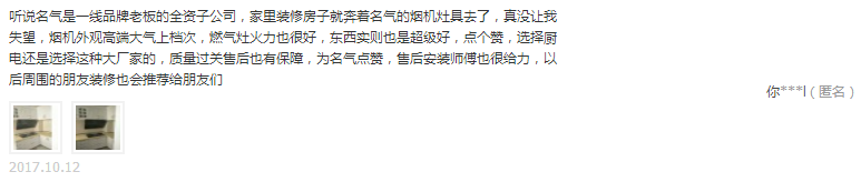 名氣廚房電器質(zhì)量怎么樣? 來源:名氣廚房電器 時(shí)間:2018年02月25日 名氣廚房電器的質(zhì)量是值得信賴的,雖然公司成立只有短短十幾年,但是他們的產(chǎn)品制作工藝卻有四十年齡限,傳承的是老板電器產(chǎn)品的品質(zhì)底蘊(yùn),宣揚(yáng)的是“經(jīng)久耐用的廚房電器”這種服務(wù)理念。 在從質(zhì)量上,每件產(chǎn)品必須通過30道耐用測試保障產(chǎn)品的質(zhì)量。 在服務(wù)上,售后服務(wù),安裝服務(wù),咨詢服務(wù),專業(yè)一條龍。 網(wǎng)友評價(jià) 網(wǎng)友(你***1):聽說名氣是一線品牌老板的全資子公司,家里裝修房子就奔著名氣的煙機(jī)灶具去了,真沒讓我失望,煙機(jī)外觀高端大氣上檔次,燃?xì)庠罨鹆σ埠芎茫瑬|西實(shí)則也是超級好,點(diǎn)個(gè)贊,選擇廚電還是選擇這種大廠家的,質(zhì)量過關(guān)售后也有保障,為名氣點(diǎn)贊,售后安裝師傅也很給力,以后周圍的朋友裝修也會(huì)推薦給朋友們。 網(wǎng)友(藍(lán)***鳥) 初次評價(jià): 油煙機(jī)非常高大上,本地安裝服務(wù)也非常好,及時(shí)態(tài)度好,安裝后試用,效果沒話說!贊 收貨2天后追加: 真的很漂亮大氣,發(fā)張圖片大家看一下 Last:家用消毒柜需要買嗎?看完這篇就知道了Next:油煙機(jī)自己動(dòng)手拆機(jī)也能洗干凈,再也不用花...