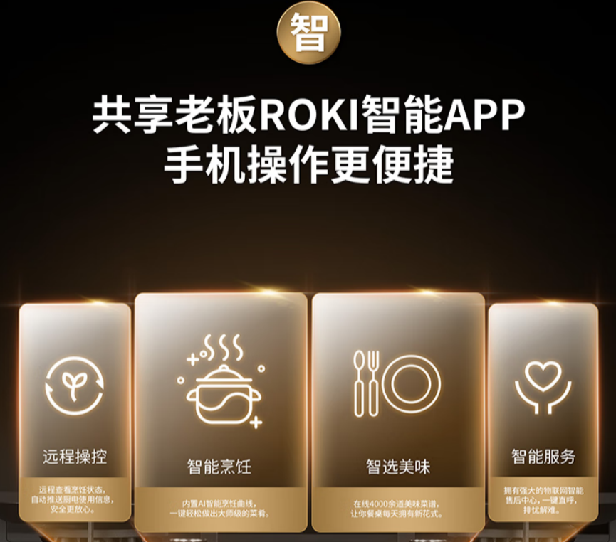 值得一提的是,在93系新品蒸烤炸一體集成灶939FT上,我們既看到了1100Pa大風壓、20m3/min大吸力以及5.2KW大火力等高性能參數(shù),同時還看到了全面搭載的老板電器ROKI智能烹飪系統(tǒng)。