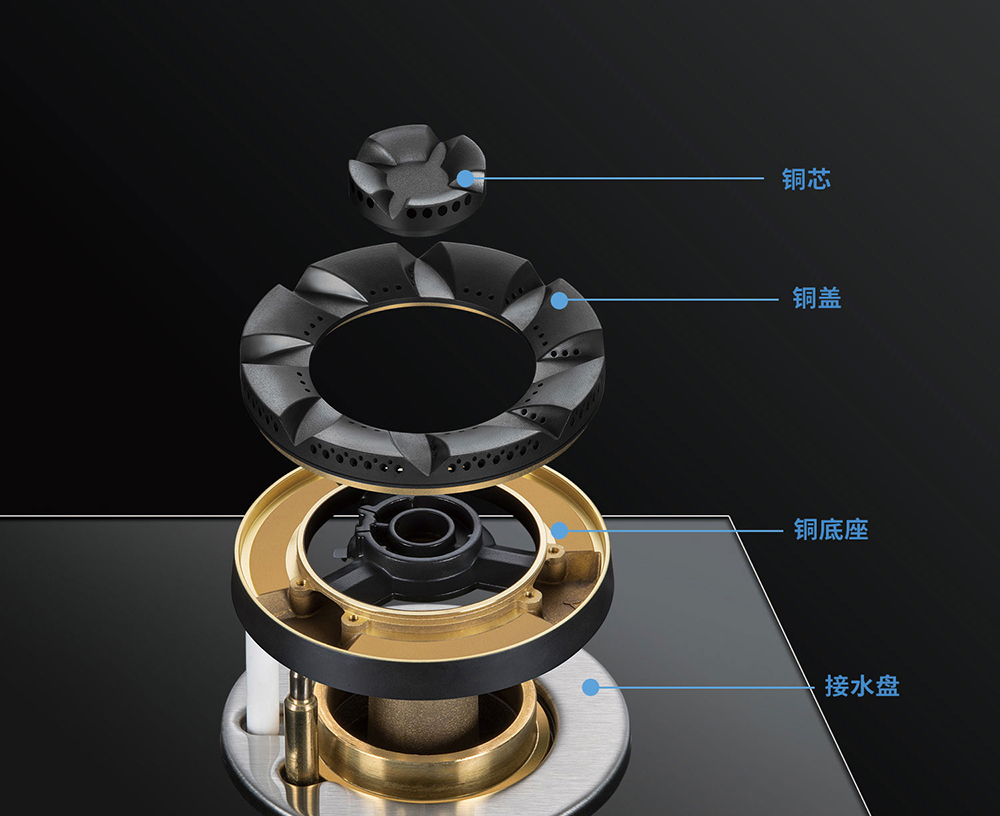 易清潔結(jié)構(gòu),爐頭可拆,旋鈕側(cè)置。易清潔材質(zhì),全銅爐頭,搪瓷接水盤。